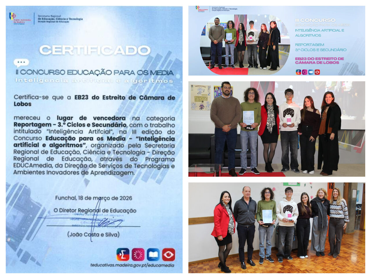 No passo 18 de março a escola EBECL foi distinguida com o prémio de melhor reportagem do 3.º ciclo e ensino secundário no concurso “Educação para os Media, Inteligência Artificial e Algoritmos”, uma iniciativa promovida pela Secretaria Regional de Educação, através da Direção Regional de Educação, em parceria com a equipa Educamedia.